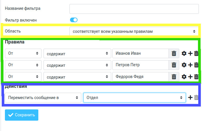 Кнопка «Действия» позволяет создать, изменить, включить/выключить, удалить или экспортировать набор фильтров. Кнопки «Создать» и «Удалить» сверху справа совершают одноименные действия с выбранным фильтром из списка слева. «Область» задает правило отбора писем. Здесь есть 3 варианта: