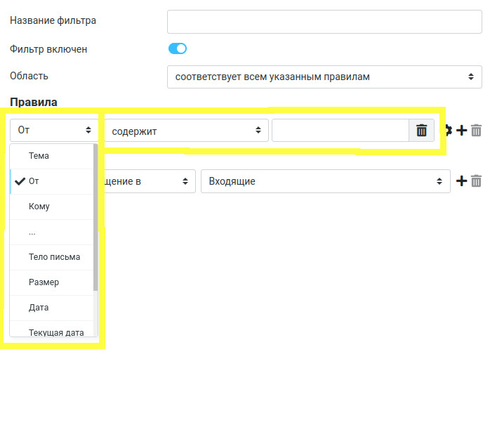 Правилом можно отбирать письма по трем критериям: