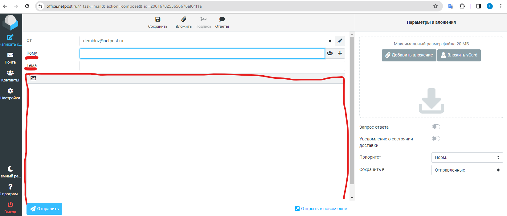 Откроется форма для отправки. Здесь нас интересуют только три поля: Кому, Тема и большая часть для ввода текста.