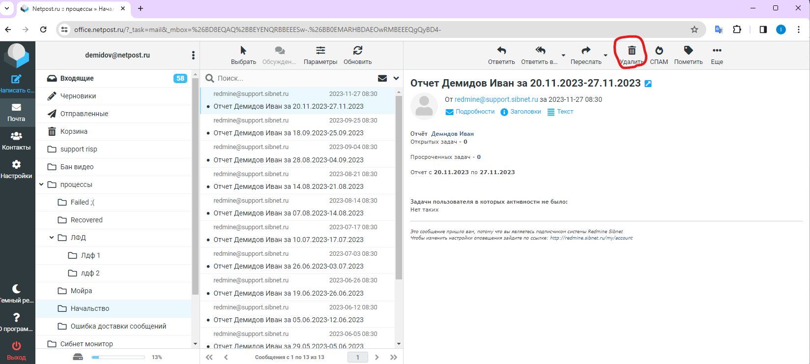 Удаление писем