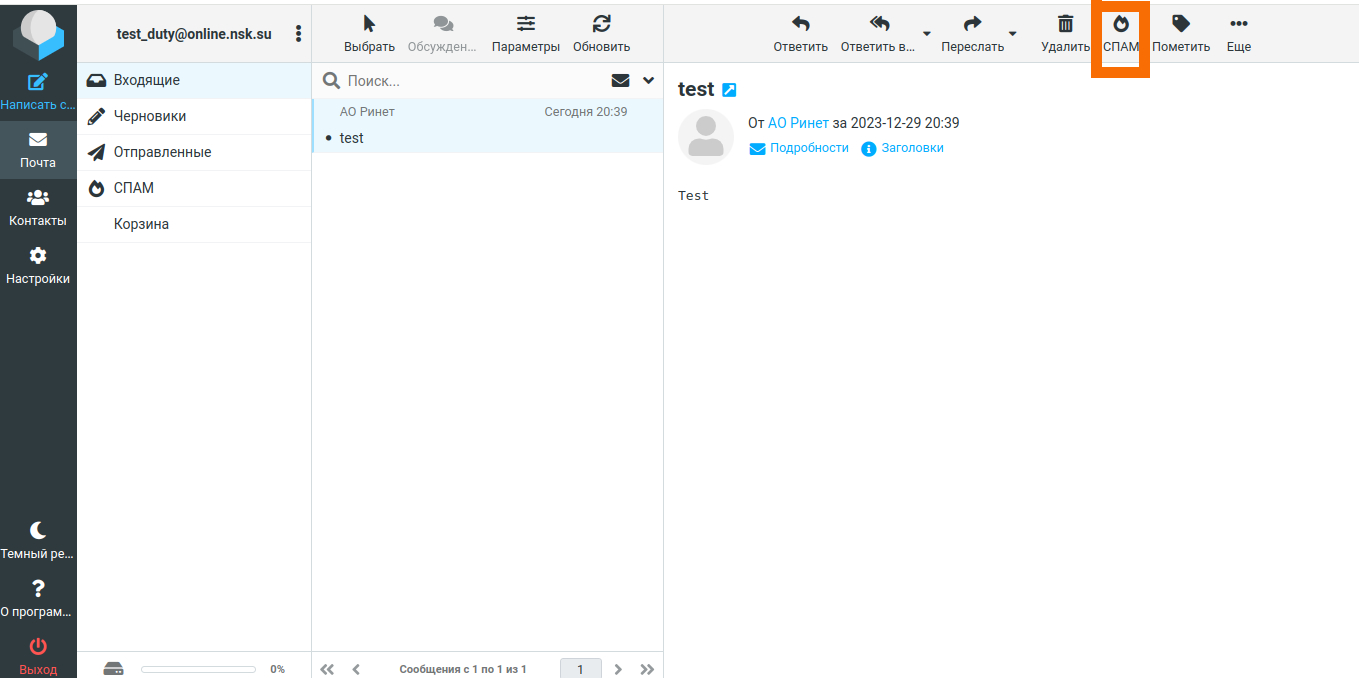 Если вы отметили письмо как спам по ошибке, его можно вернуть во входящие сообщения. Для этого нажмите на папку «Спам», выберете нужное письмо и нажмите «Не спам»