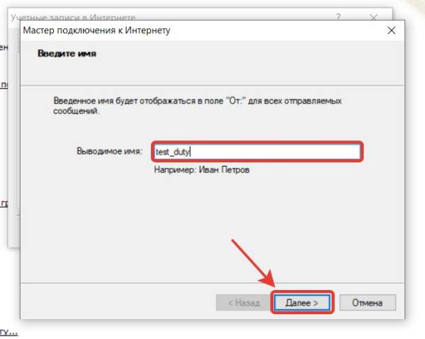10. Укажите имя, которое будет использоваться при отправки сообщений и нажмите «Далее»: