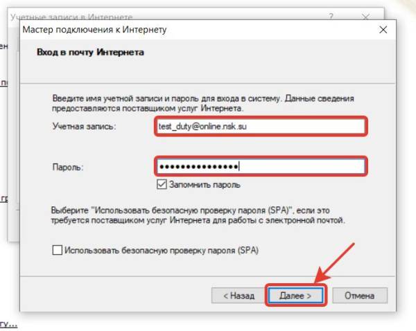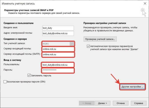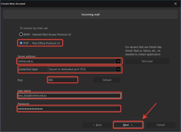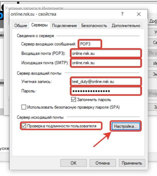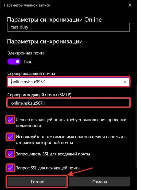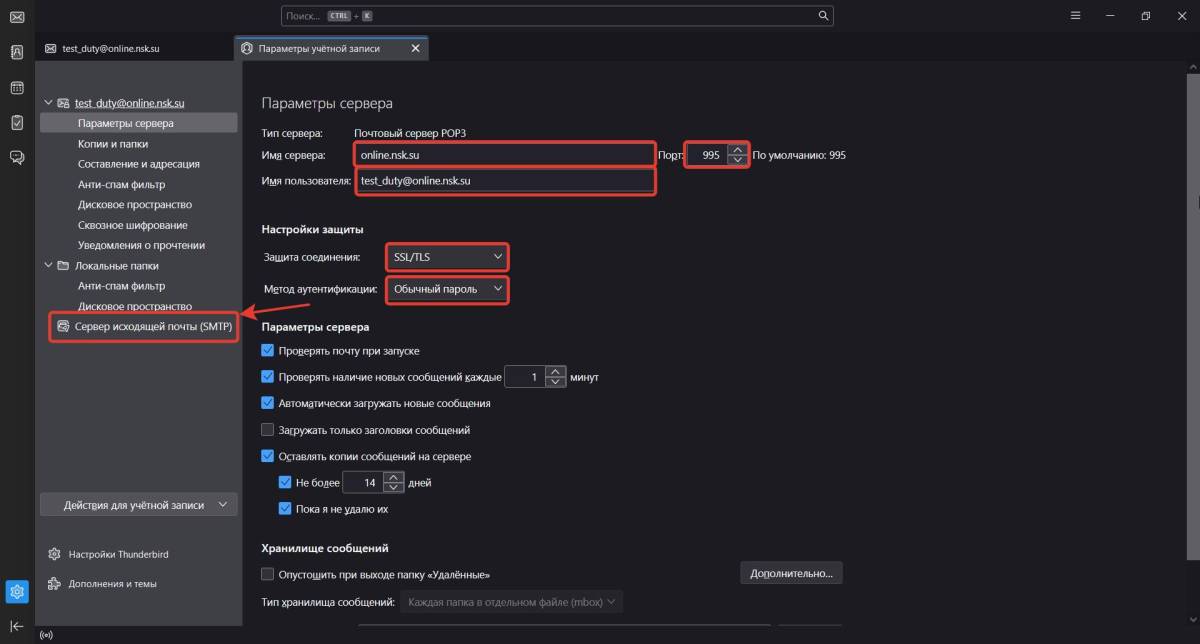 Входящая почта — укажите сервер входящей почты online.nsk.su и порт 995, отметьте галочкой графу «Требуется шифрованное подключение(SSL/TLS)»;