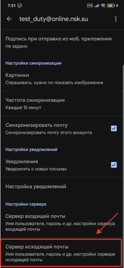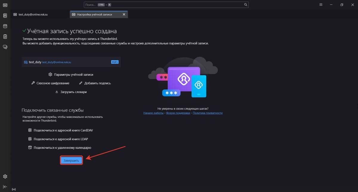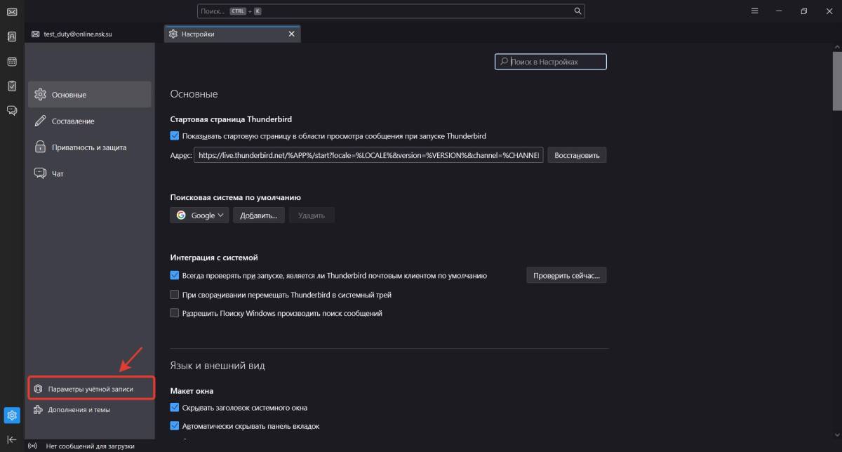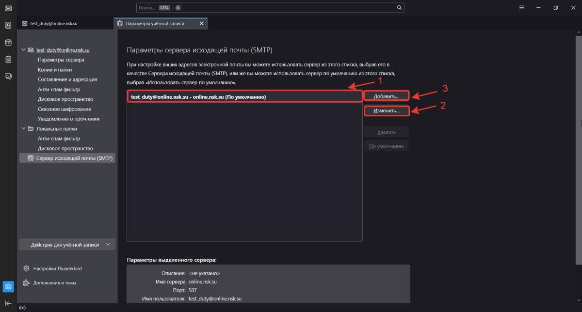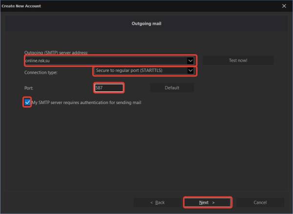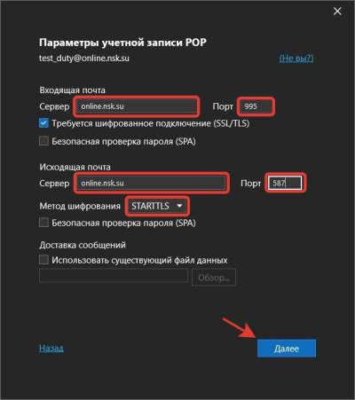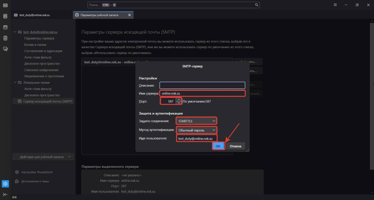 Исходящая почта — укажите сервер исходящей почты online.nsk.su и порт , выберите 587, выберите тип шифрования «STARTTLS».