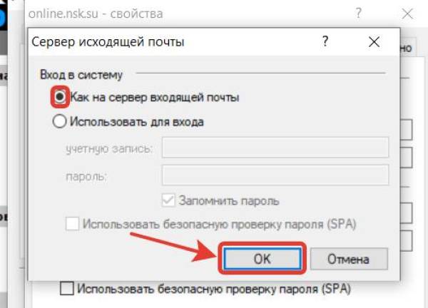 Cервер исходящей почты требует выполнения проверки подлинности;