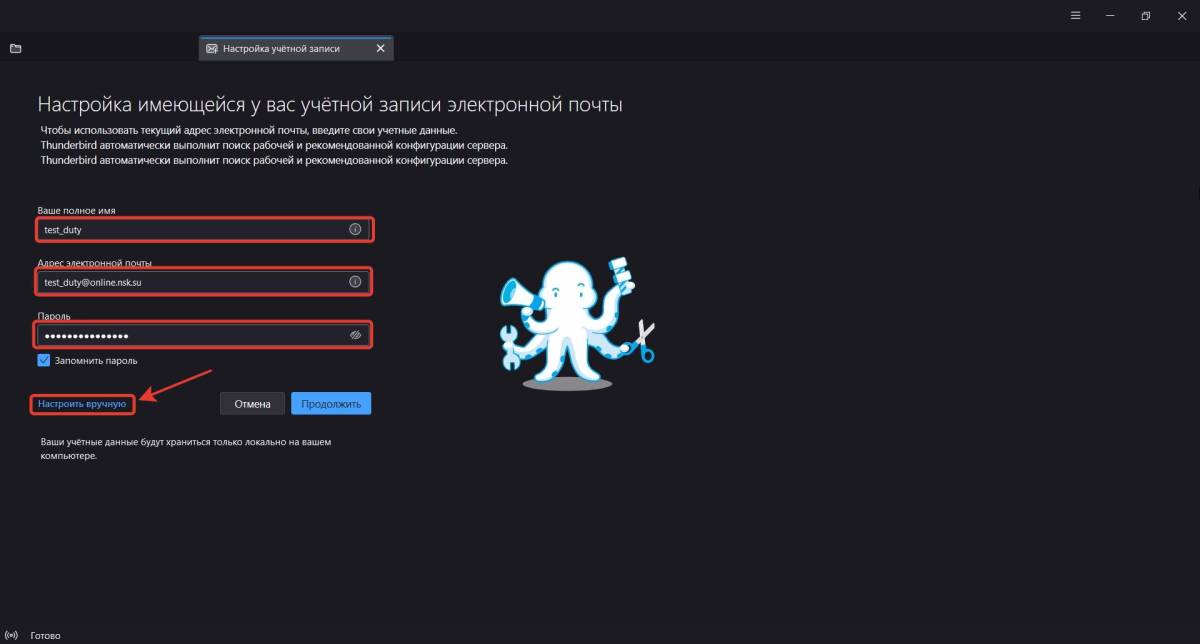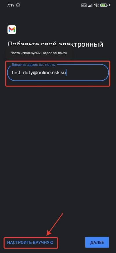 6. Укажите адрес вашей электронной почты и нажмите «Настроить вручную»: