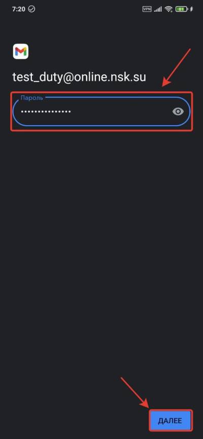 6. Введите пароль от вашего аккаунта почты (Чтобы проверить правильность написания можно использовать кнопку отображения пароля в правом углу окна ввода).