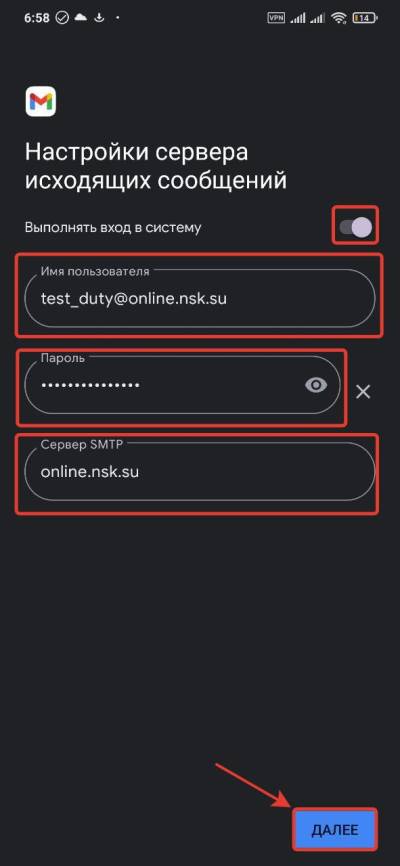 10. Заполните разделы для сервера исходящей почты (для отображения полей необходимо включить «Выполнить вход в систему»):