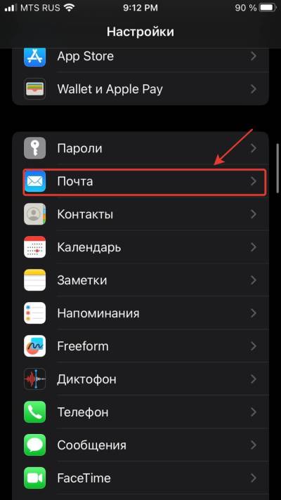 2. Опустите меню настроек вниз, пока не найдете пункт «Почта». Выберите его: