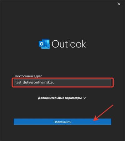 2. Укажите адрес вашей электронной почты. Во вкладке Дополнительные параметры выберите Настроить учетную запись вручную и кликните Подключить: