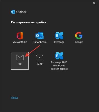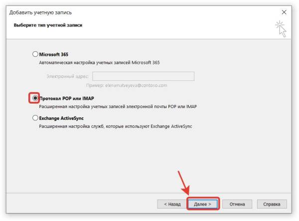 8. Выберите пункт «Протокол POP или IMAP» и нажмите кнопку «Далее»: