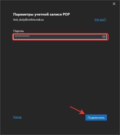 8. Введите пароль от вашего аккаунта почты (Чтобы проверить правильность написания можно использовать кнопку отображения пароля в правом углу окна ввода).