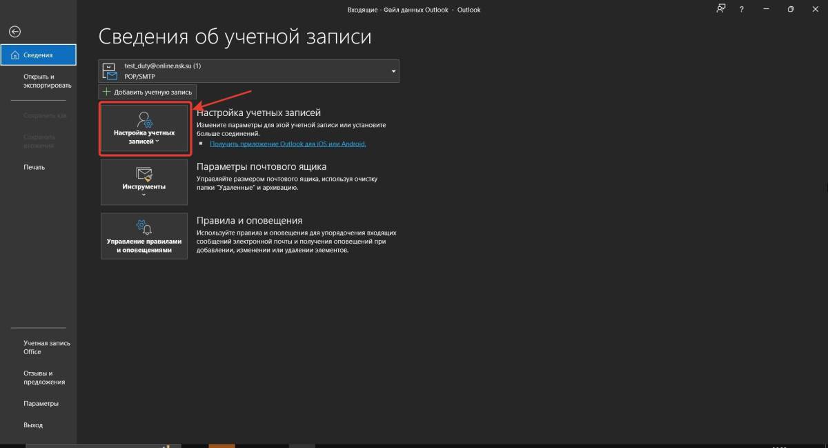 3. Нажмите на кнопку «Настройки учетных записей»: