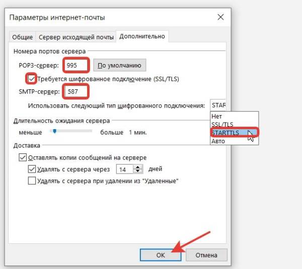 Отметьте галочкой графу «Требуется шифрованное подключение(SSL/TLS)»;