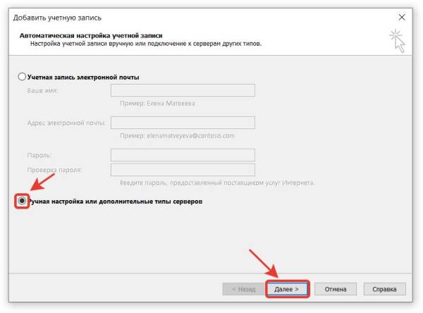 7. Выберите пункт «Ручная настройка или дополнительные типы серверов» и нажмите кнопку «Далее»: