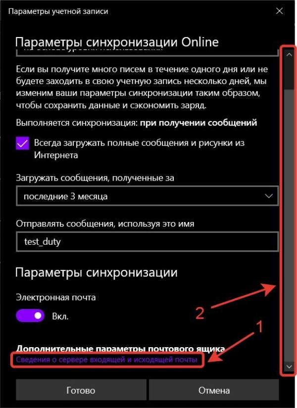 6. Нажмите «Сведения о сервере входящей и исходящей почты»(1), а после, как и в предыдущем пункте, прокрутите окно вниз(2):